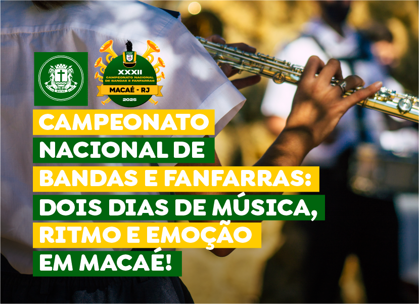 O XXXII Campeonato Nacional de Bandas e Fanfarras acontecerá em Imbetiba nos dias 29 e 30, a partir das 8h. O evento é organizado pela Confederação Nacional de Bandas e Fanfarras (CNBF) e conta com o apoio da Prefeitura de Macaé.